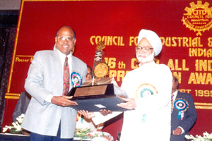 Mr. V. Ramakrishna Rao receiving the Gold Medal award from Mr Manmohan Singh, Finance Minster ( Mr Manmohan Singh is Present Prime Minister of India) for Production and Industrial Relations in 1993-94. |